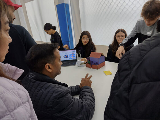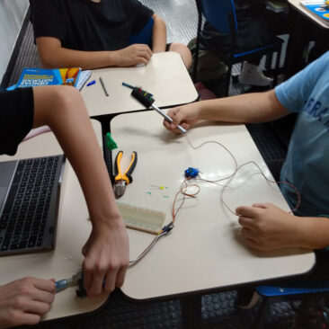 Em junho, os projetos ganharam novas camadas de complexidade com a introdução de sensores e atuadores, possibilitando interações mais dinâmicas nos protótipos. Além disso, os alunos foram incentivados a relacionar seus projetos com os Objetivos de Desenvolvimento Sustentável (ODS), trazendo um olhar crítico e social para o uso da tecnologia. Após o recesso, em agosto, a atenção voltou-se para a pinagem dos circuitos eletrônicos, etapa fundamental para compreender o funcionamento das placas e organizar conexões de forma clara. Também avançaram na programação de circuitos mais elaborados, reforçando a importância da lógica de controle.