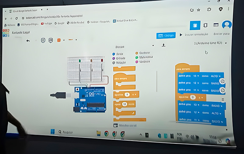 Ao longo de 2025, os estudantes do 8º ano mergulharam em experiências práticas com eletrônica, programação e design digital, sempre integrando criatividade, colaboração e reflexão sobre o uso da tecnologia no cotidiano. Em fevereiro, tiveram o primeiro contato com o Arduino por meio do Tinkercad, ambiente de simulação digital. O aprendizado começou de forma simples, com o clássico blink – o piscar de um LED controlado por programação –, permitindo compreender a lógica básica entre software e hardware.