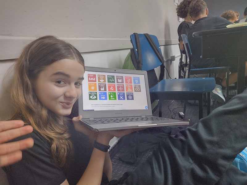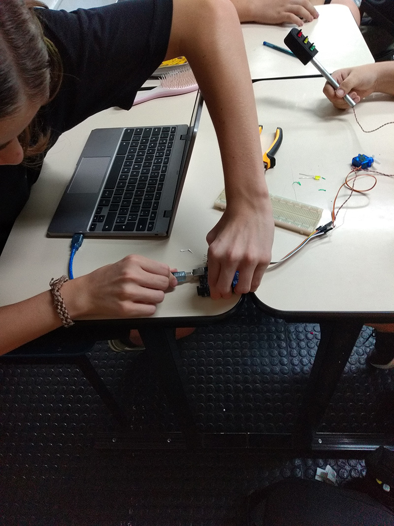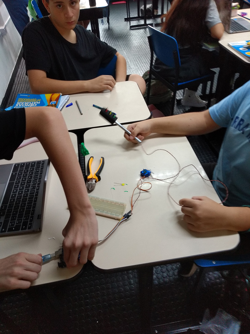 Em junho, os projetos ganharam novas camadas de complexidade com a introdução de sensores e atuadores, possibilitando interações mais dinâmicas nos protótipos. Além disso, os alunos foram incentivados a relacionar seus projetos com os Objetivos de Desenvolvimento Sustentável (ODS), trazendo um olhar crítico e social para o uso da tecnologia. Após o recesso, em agosto, a atenção voltou-se para a pinagem dos circuitos eletrônicos, etapa fundamental para compreender o funcionamento das placas e organizar conexões de forma clara. Também avançaram na programação de circuitos mais elaborados, reforçando a importância da lógica de controle.